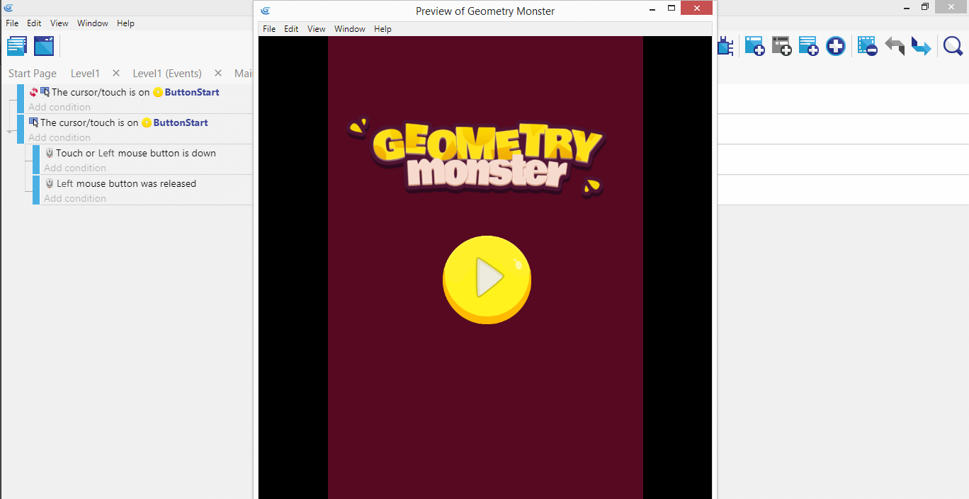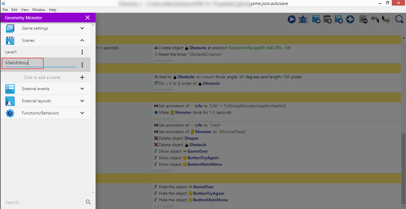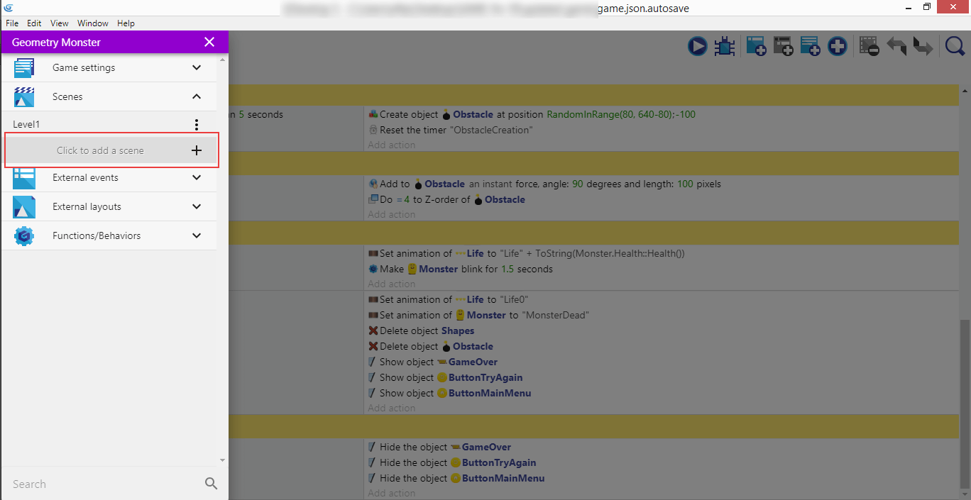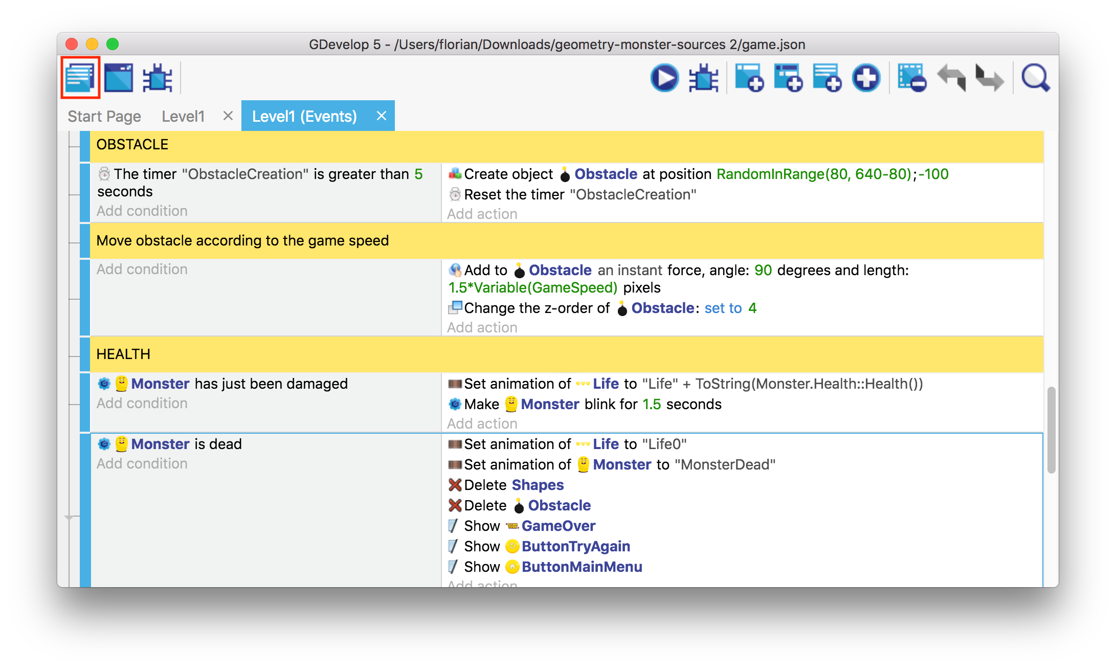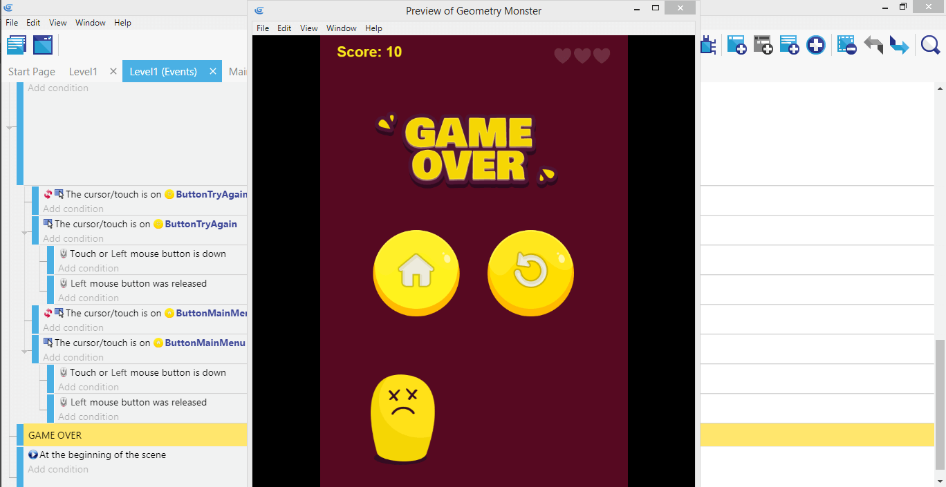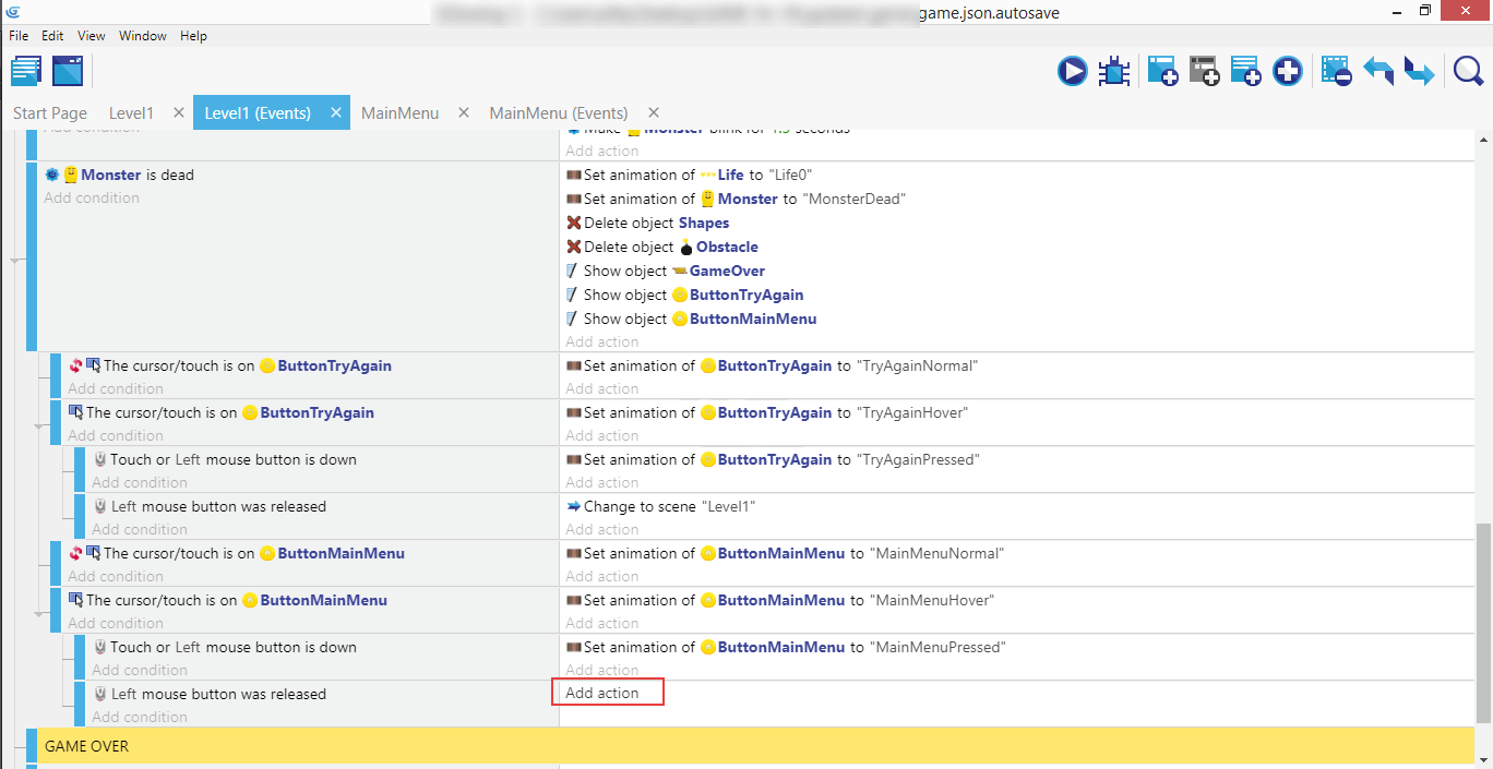 Un autre sous-événement, la condition Left mouse button was released puis l'action : Change the scene pour "Level1", de sorte que le bouton pour réessayer le jeu redémarre le gameplay.