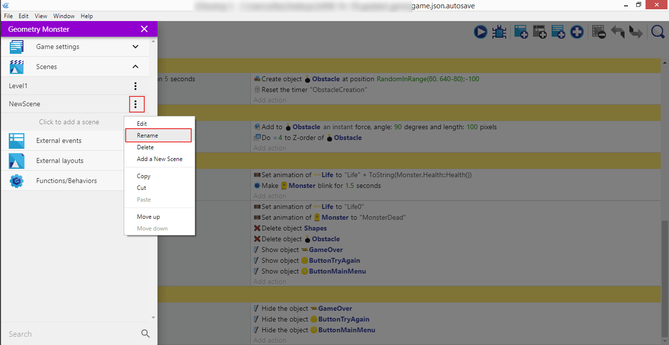 Le nom par défaut de la nouvelle scène est NewScene, mais vous pouvez cliquer avec le bouton droit sur les trois points verticaux à droite pour ouvrir le menu contextuel et sélectionner Rename (Renommer).