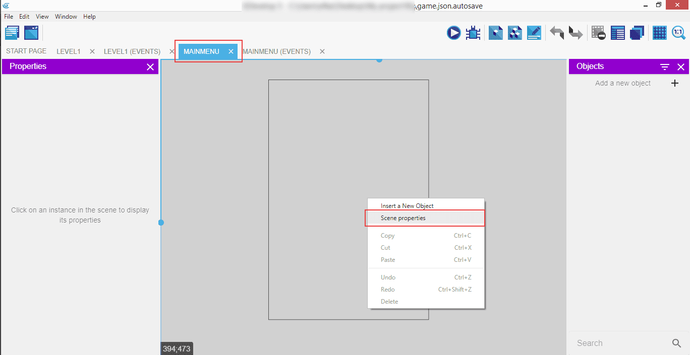Cliquez sur l'onglet MAIN MENU (Menu principal), puis cliquez avec le bouton droit sur la scène et sélectionnez Scene properties (Propriétés de la scène).
