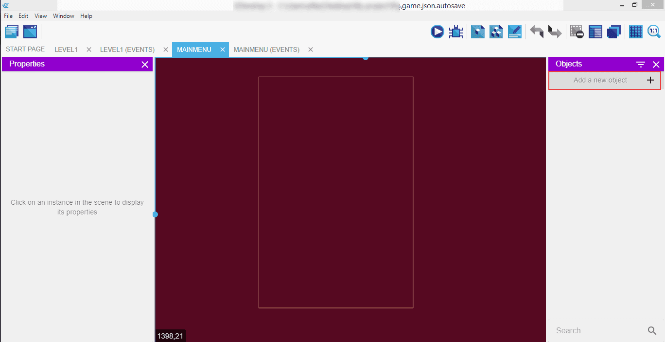 Elle devrait ressembler à cela. Cliquez sur le panneau de droite (Objects) pour ajouter un nouvel objet et sélectionnez Sprite.