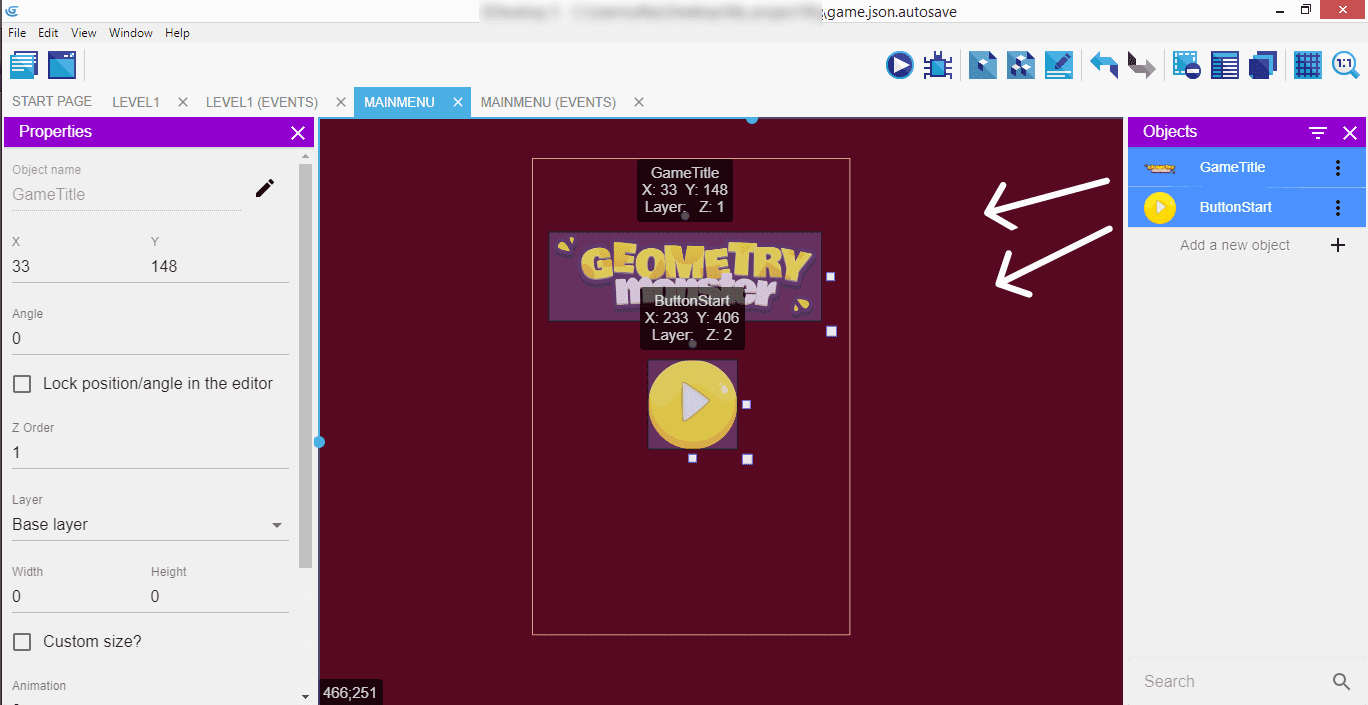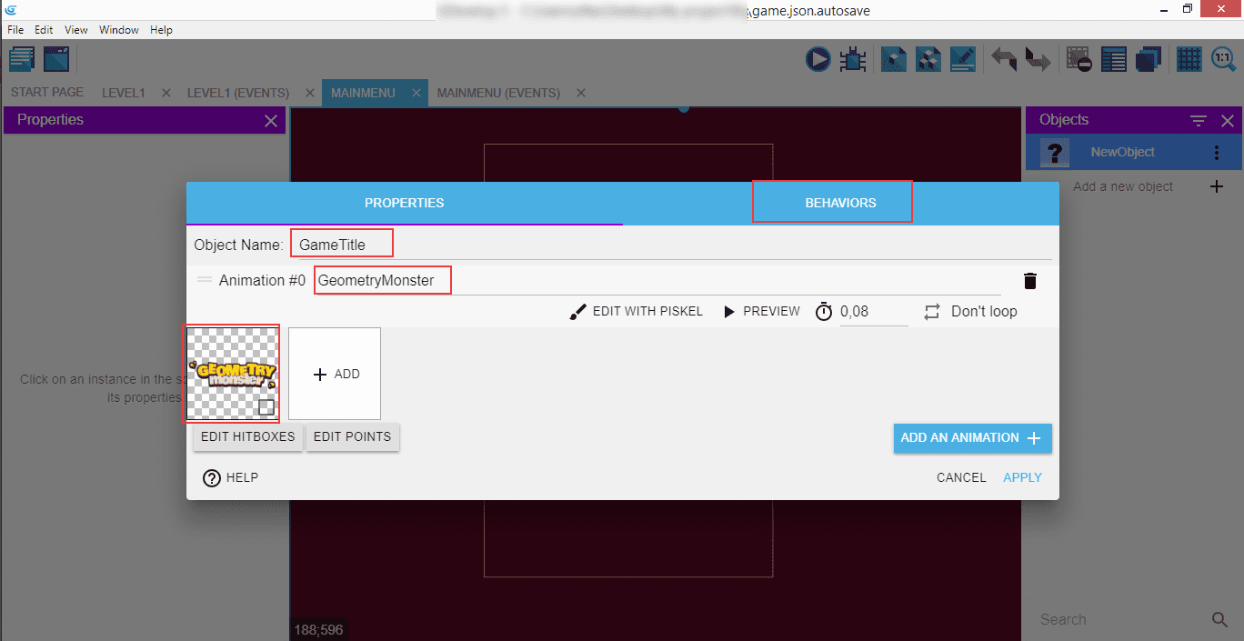 Le nom de l'objet est GameTitle et celui de l'animation GeometryMonster. Ajoutez l'image du titre et cliquez sur BEHAVIORS (Comportements).