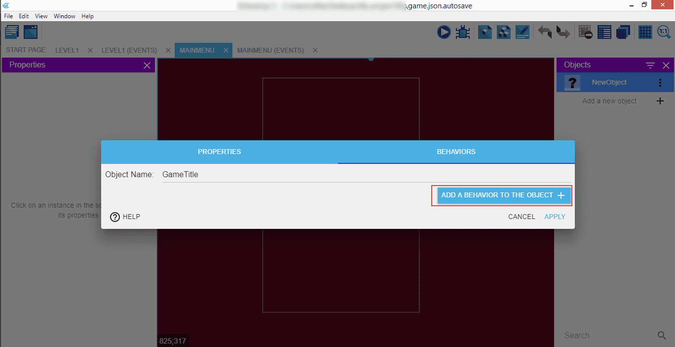 Cliquez sur le bouton ADD A BEHAVIOR TO THE OBJECT.