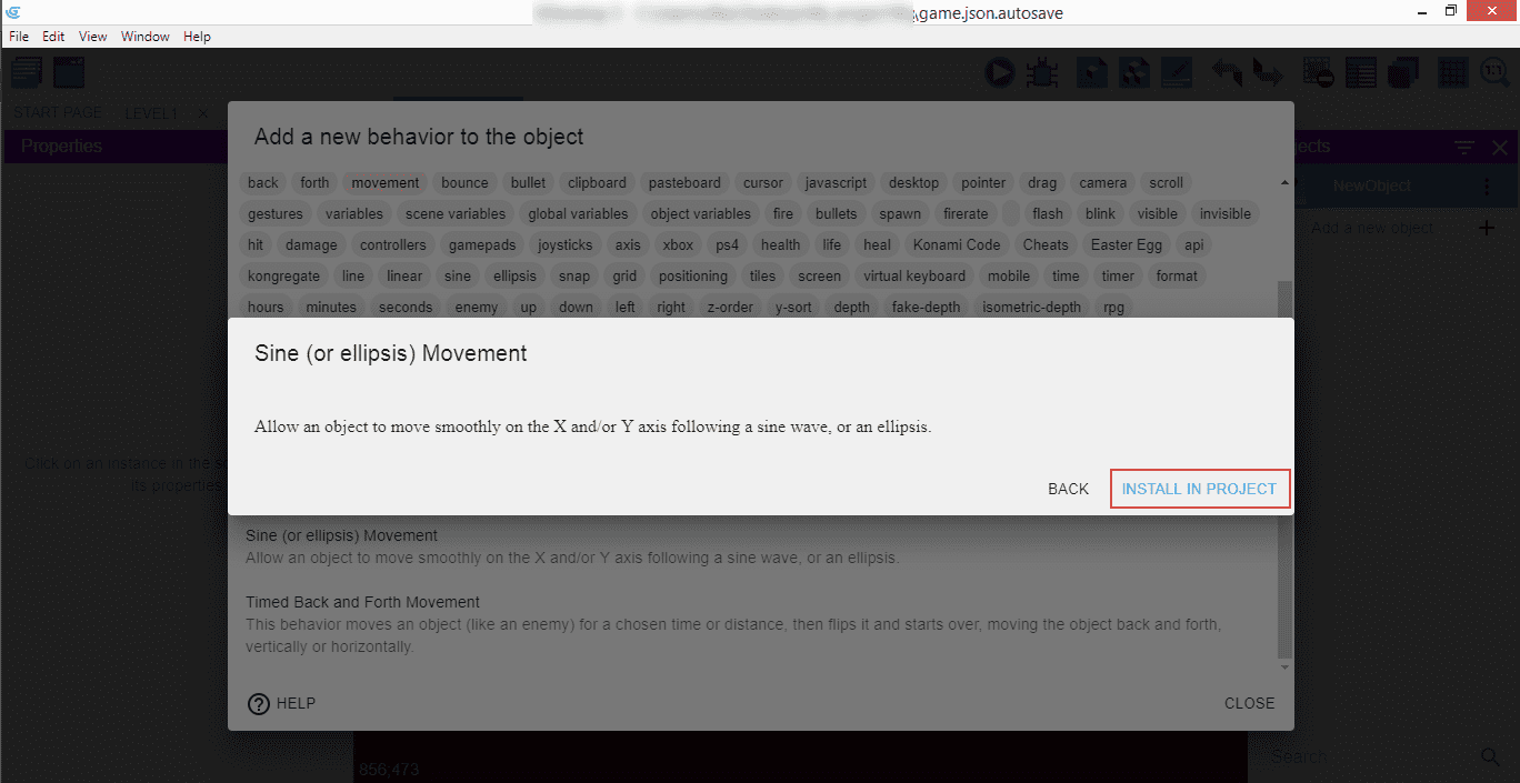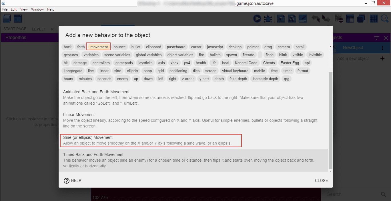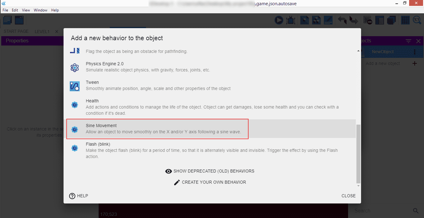 Parcourez la liste des comportements et cliquez sur le nouveau Sine movement (Mouvement sinusoïdal).