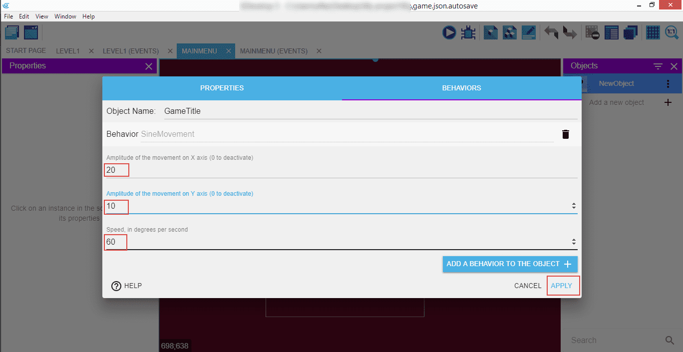 Configurez-le comme suit : (Object name) a pour nom GameTitle, Amplitude of the movement on the X axis to (Amplitude du mouvement sur l'axe X) à 20, Amplitude of the movement on the Y axis (Amplitude du mouvement sur l'axe Y) à 10 et Speed (Vitesse) à 60 degrés par seconde, puis cliquez sur APPLY.
