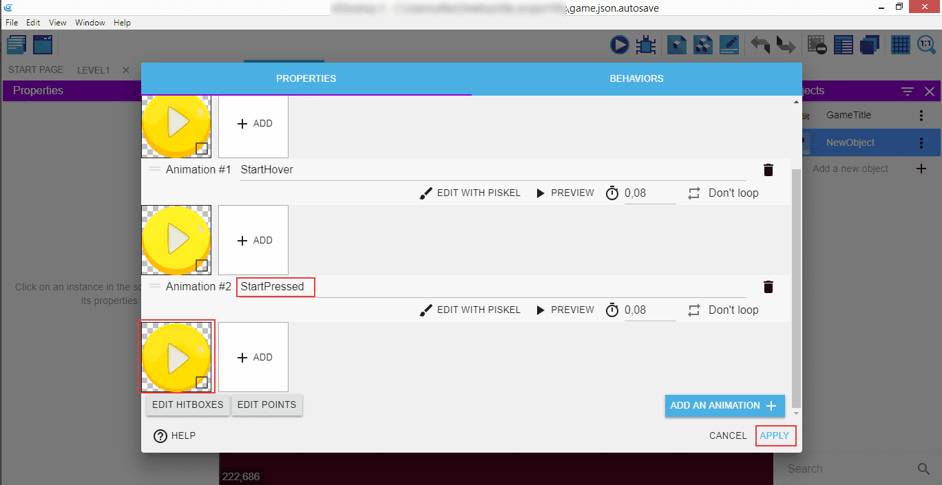 Ajoutez deux autres animations avec leurs images respectives : StartHover et StartPressed.