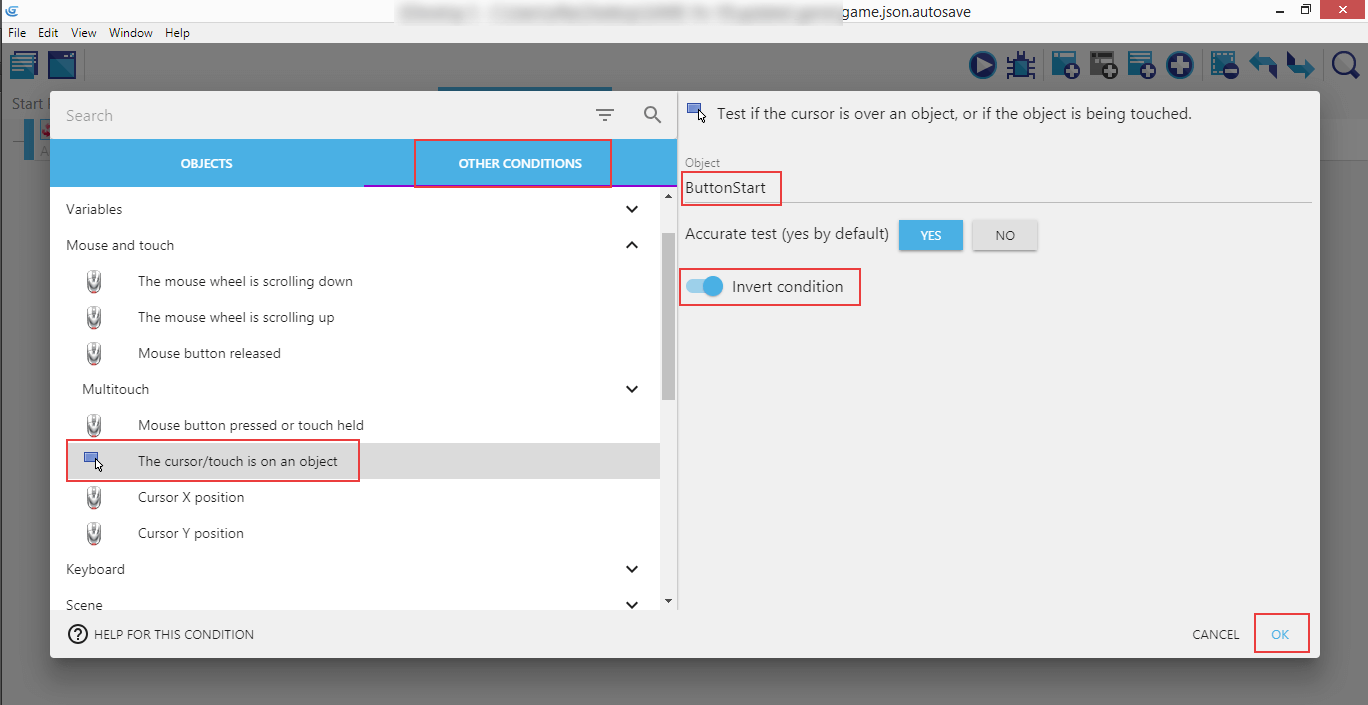 Ajoutez une nouvelle condition : cliquez sur OTHER CONDITIONS (Autres conditions), puis sur The cursor/touch is on an object (Le curseur/toucher est sur un objet), et affectez-le à ButtonStart. N'oubliez pas de sélectionner Invert condition (Inverser la condition) pour que cela fonctionne comme nous le voulons.