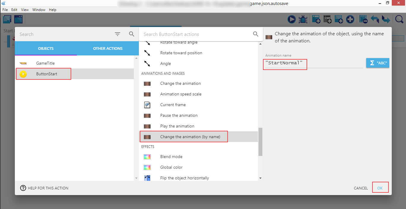 Ajoutons les animations à ce bouton. Sélectionnez ButtonStart dans le panneau de gauche, cliquez sur Change the animation (by name) (Modifier l'animation (par son nom)) dans celui du milieu et entrez StartNormal dans le panneau de droite.
