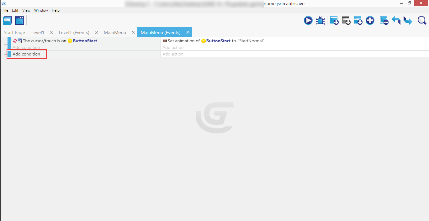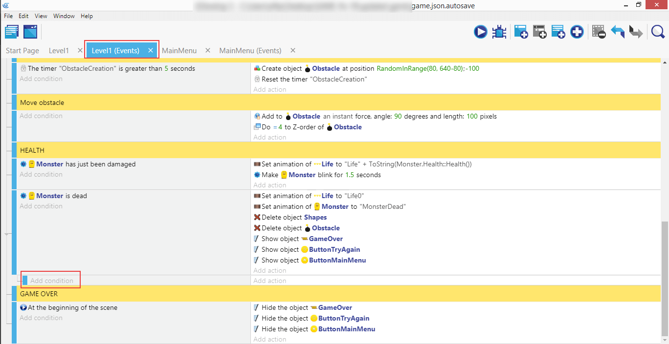 Puisque nous savons maintenant comment passer d'une scène à l'autre, faisons-le pour le bouton Réessayer que nous avons créé plus tôt, mais pour lequel nous n'avons pas encore implémenté l'action réelle. Cliquez sur l'onglet Level1 (Events) et Add condition.