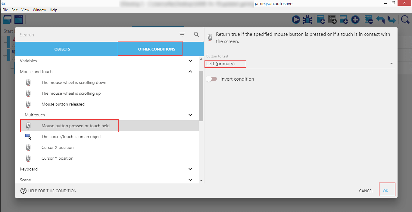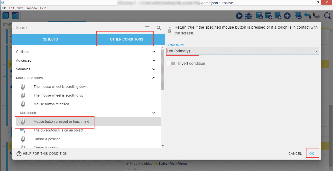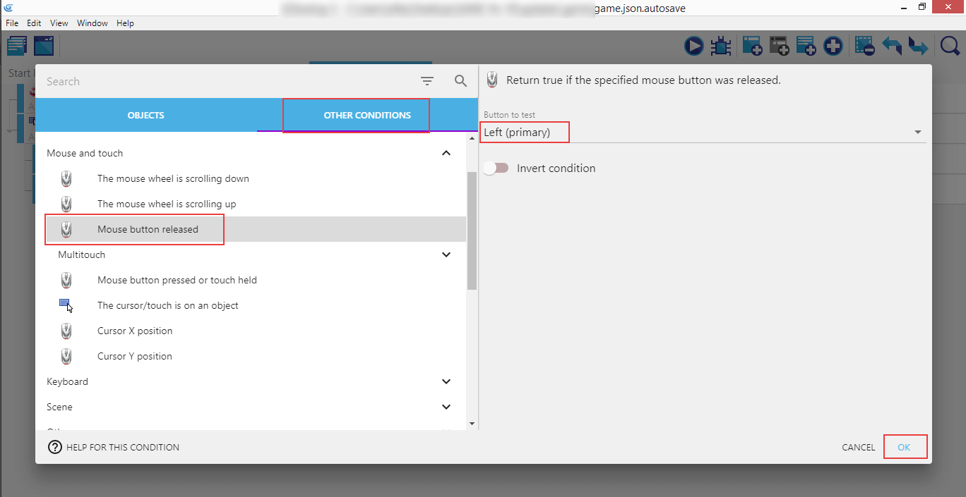Créez un sous-événement et sa condition. Sélectionnez le ButtonTryAgain puis OTHER CONDITIONS, Mouse button pressed or touch held, Left (primary).