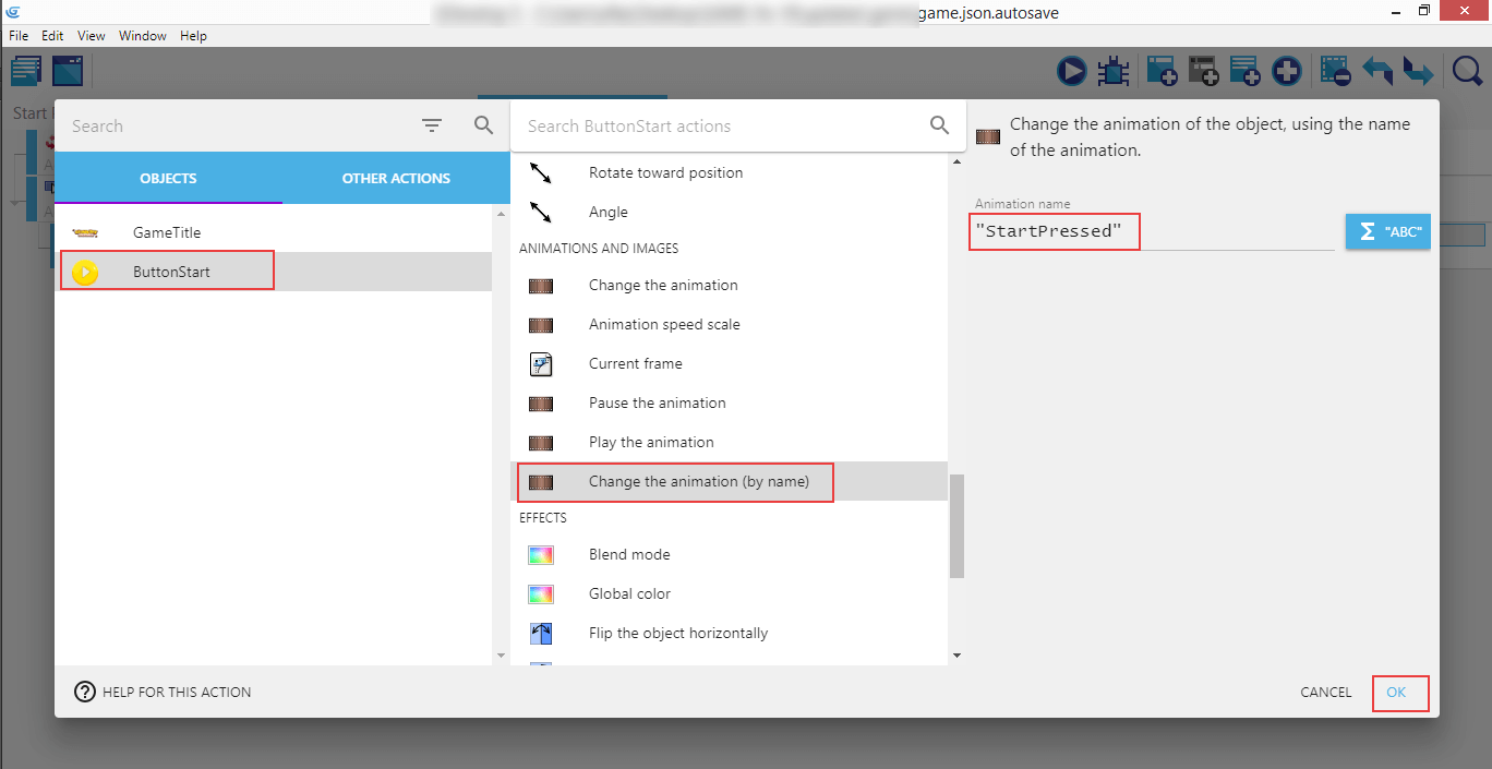 Maintenant ButtonStart, Change the animation (by name), "StartPressed" ...