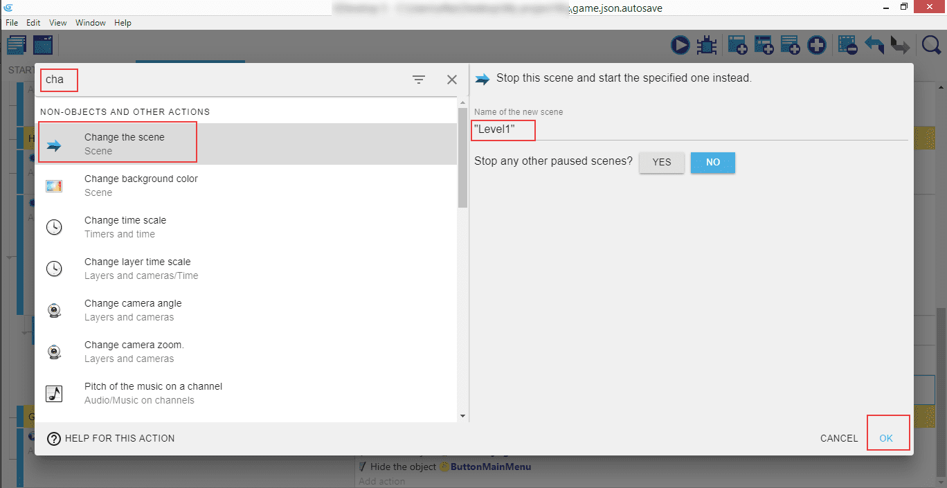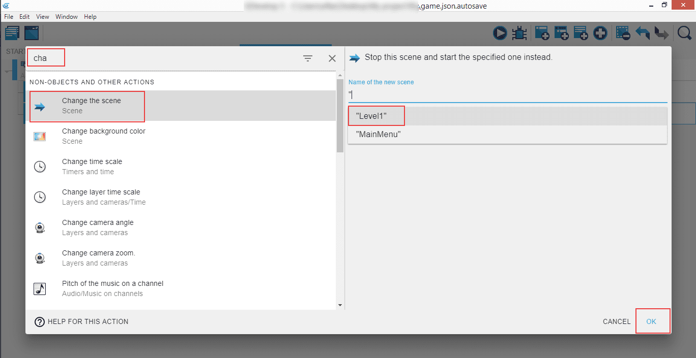 L'action que ce bouton va effectuer consiste à changer de scène pour passer à celle du jeu proprement dit. Recherchez Change the scene (Changer la scène), puis sélectionnez "Level1".