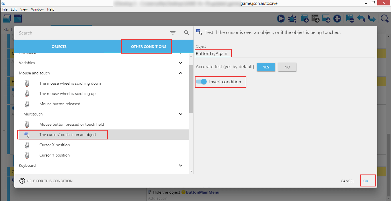 Cliquez sur OTHER CONDITIONS, The cursor/touch is on an object, puis spécifiez l'objet ButtonTryAgain, activez Invert condition et finalement pressez OK.