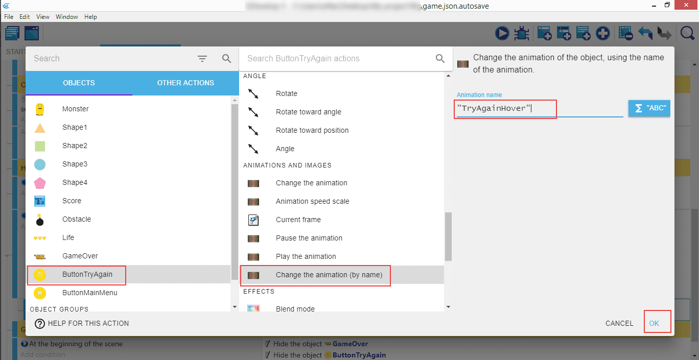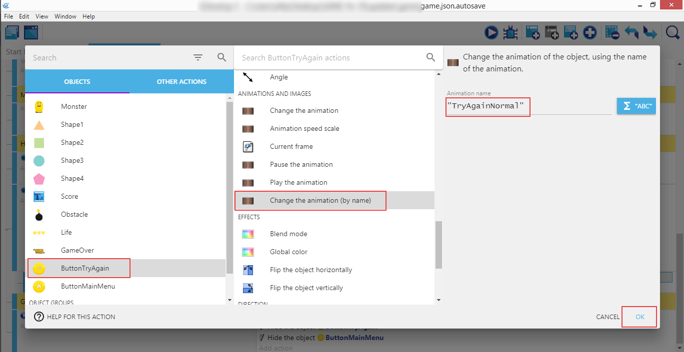 Maintenant ajoutez une action : ButtonTryAgain, Change the animation (by name), et "TryAgainNormal".
