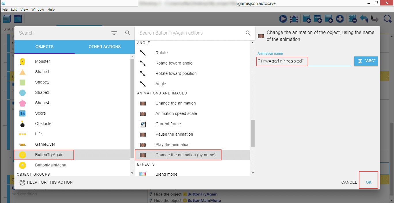 Répétez l'action : ButtonTryAgain, Change the animation (by name), "TryAgainPressed".