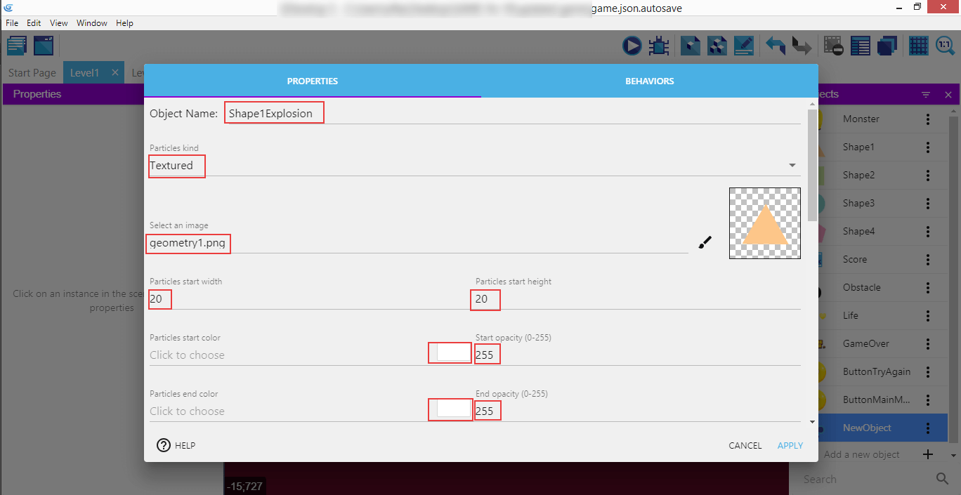 Those emitters will spawn small shapes as particles after the Monster collects it. Object's name will be "Shape1Explosion", kind of particles: "Textured", then select the geometry1.png image, and enter the respective values: start with 20 particles, their height will be 20 pixels, start and end opacity will be 255, so they will be fully visible.