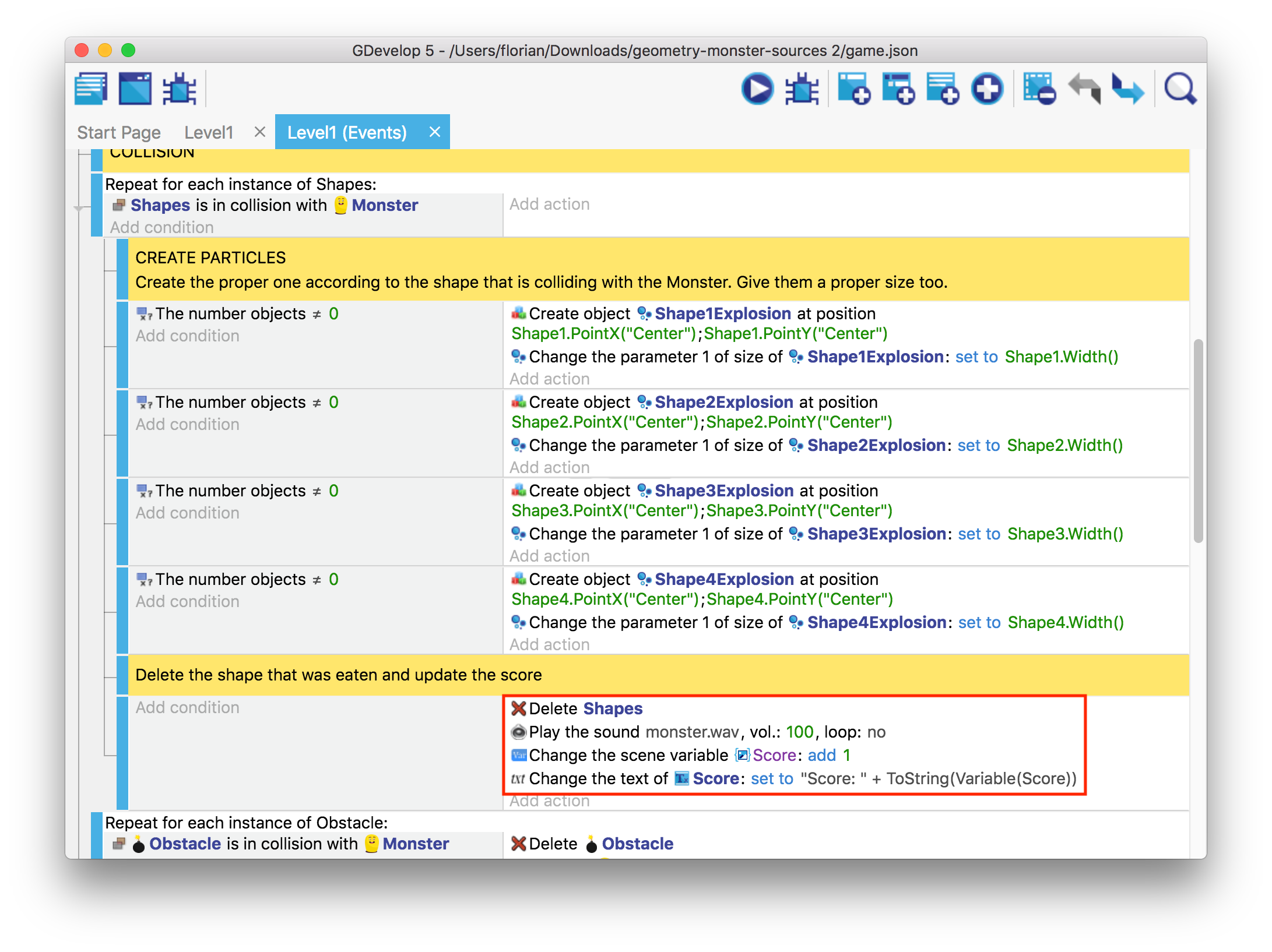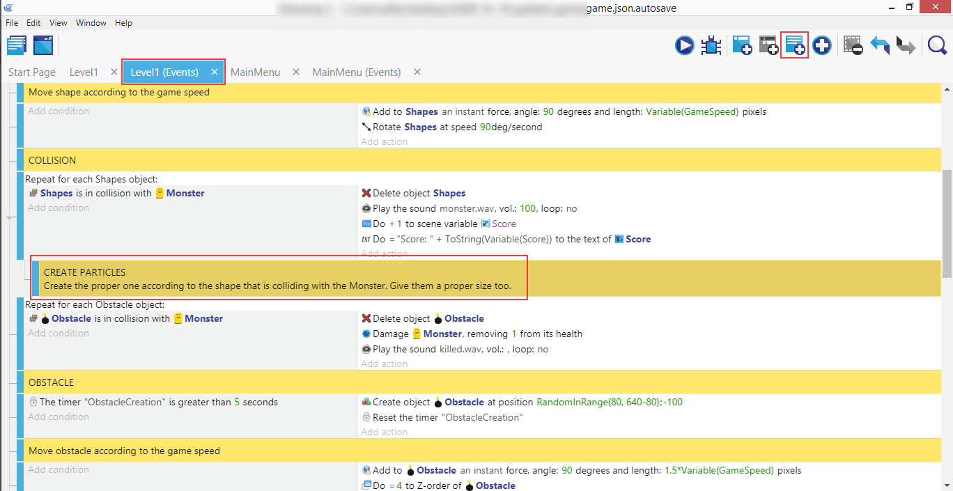 In this last piece we're introducing little bits that can make the game really stand out: progressively increasing the difficulty level, and spawning particle effects when Monster is collecting the shapes.