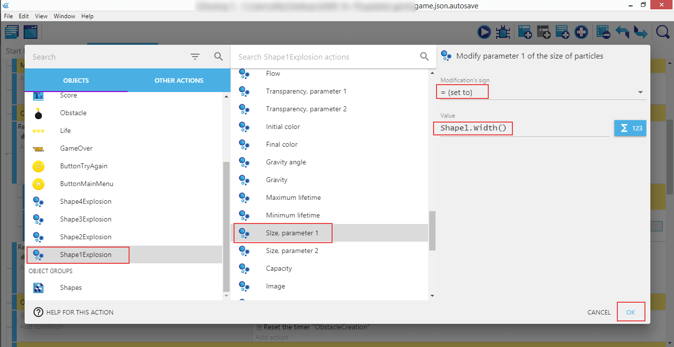 Add another action: "Shape1Explosion" again, "Size, parameter 1" and then "= (set to)" with the value Shape1.Width().